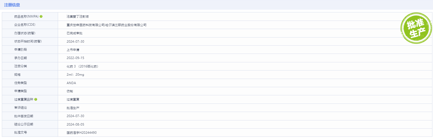 Lunarsum Pharma's Famotidine Injection has been officially approved for marketing.